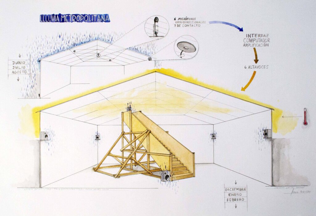 El proyecto consistió en dos etapas: INVIERNO/registro (junio, julio, agosto 2025). Durante la primera etapa se instaló un sistema de grabación de 4 micrófonos en el cielo de la Galería, cercano a las vigas que dan la estructura al espacio. Estos fueron conectados a una interfaz y un computador con internet en una sala lateral, donde estas señales acústicas fueron digitalizadas y almacenadas. La acción de “grabar” se activó de forma remota, con ayuda de un sistema VNC. Este proceso se realizó en paralelo a la programación habitual de la galería. VERANO/exhibición (enero 2026). En el periodo de exposición, una selección de las grabaciones será reproducida mediante altavoces ubicados en diversas zonas de la galería, situados de manera de recrear la percepción espacial de la lluvia a través sus cualidades sonoras. Como elemento visual principal, dentro de la galpón se ubicará un andamio, a la que será posible subir para sentir cómo la temperatura aumenta peldaño a peldaño, amplificando la disonancia afectiva y sensorial del cuerpo con el sonido alrededor. En la exposición, también habrán dibujos y circuitos electrónicos con diversas alegorías y metáforas científicas, filosóficas, religiosas y artísticas sobre la lluvia. En el futuro, y con la colaboración de Plataforma Grieta, se publicará parte del archivo sonoro generado, acompañado de textos de los artistas, de Catalina Montero, del doctor en ciencias atmosféricas Felipe Sánchez y del filósofo Sergio Rojas.